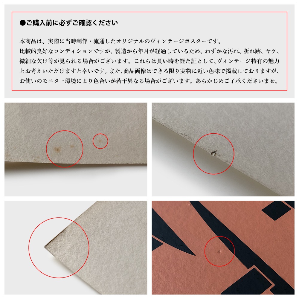 ■ヴィンテージポスターの性質上、経年によるヤケ・しみ・折れ跡・微細な破れ・欠け・波打ちなどが見られる場合がございます。これらは作品の持つ風合いや歴史的価値の一部としてご理解ください。