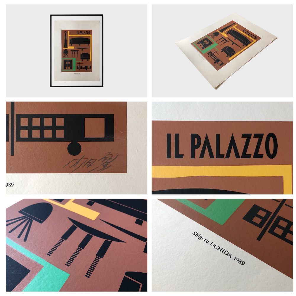 【希少なビンテージ品】内田繁 Hotel IL PARAZZO ポスター450×600mm シルクスクリーン 内田 ?サイン入り ブラウン MOEBE FRAME 額装込み【1989年オリジナルプリント】【ゆうパケット不可】