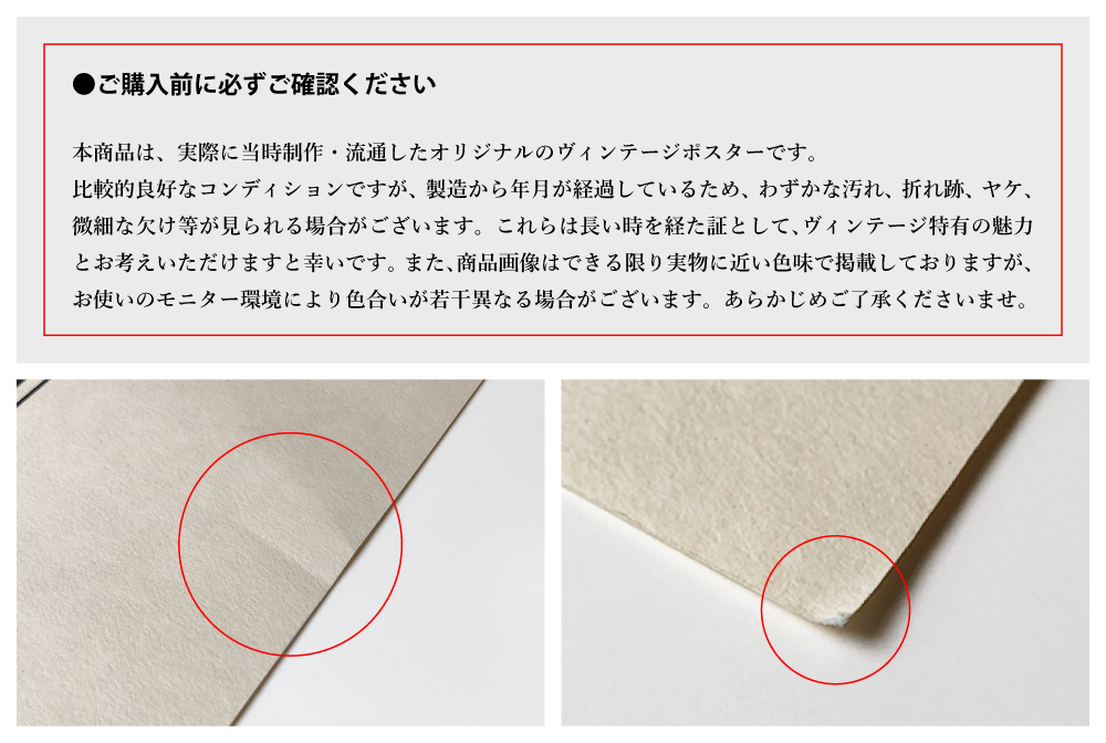 ■ヴィンテージポスターの性質上、経年によるヤケ・しみ・折れ跡・微細な破れ・欠け・波打ちなどが見られる場合がございます。これらは作品の持つ風合いや歴史的価値の一部としてご理解ください。